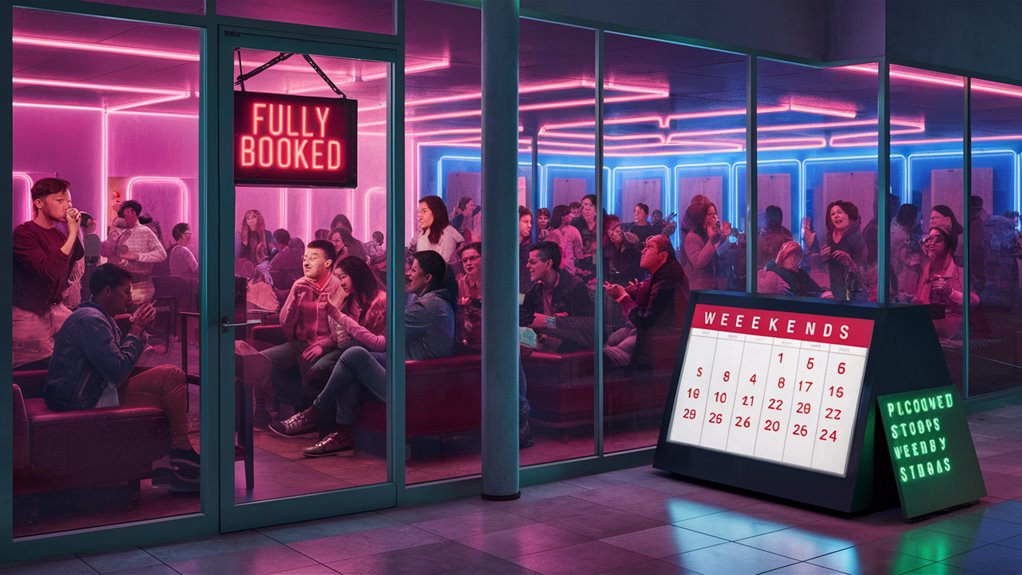 Weekend peak times from 8 PM to midnight on Fridays and Saturdays need careful, early plans. These busy periods often max out, needing bookings 2-3 weeks prior to ensure the slot and room setup you want. Early booking helps pick the best room in these high-demand hours.